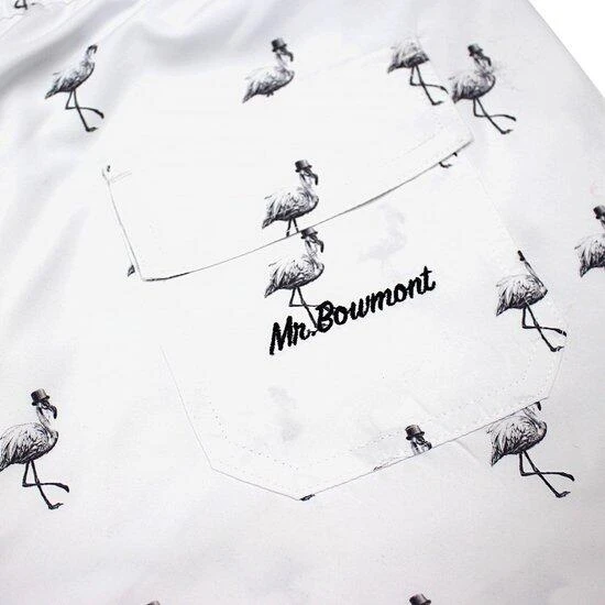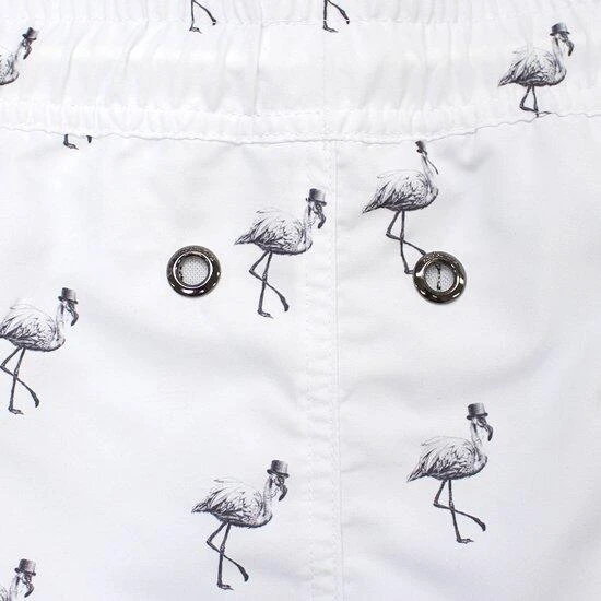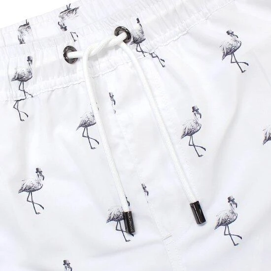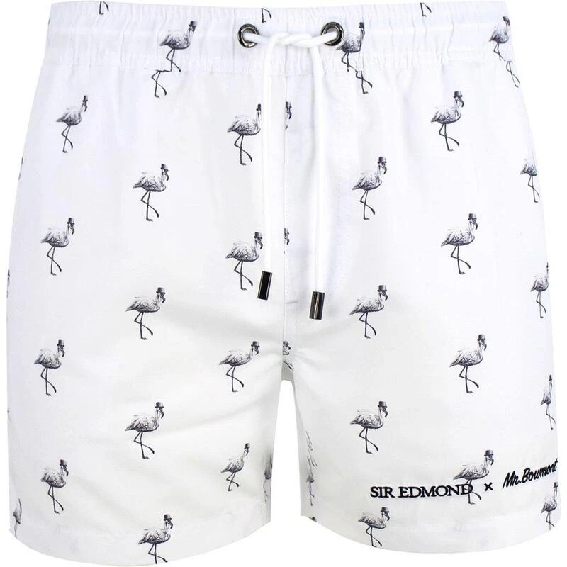 The Sir Edmond is een gebroken witte zwemshort met een relatief korte pasvorm. Het afgedrukte patroon bestaat uit de The Sir Edmond met Flamingo’s.